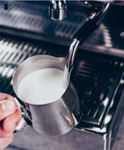 ⑦把蒸汽棒深插進牛奶,左手繼續保持旋轉,一直進行到65℃(圖B)。