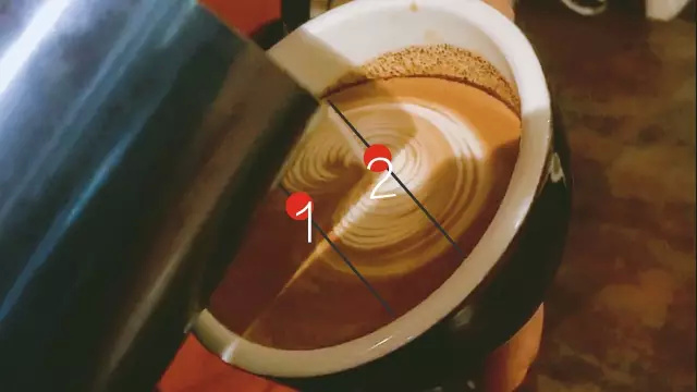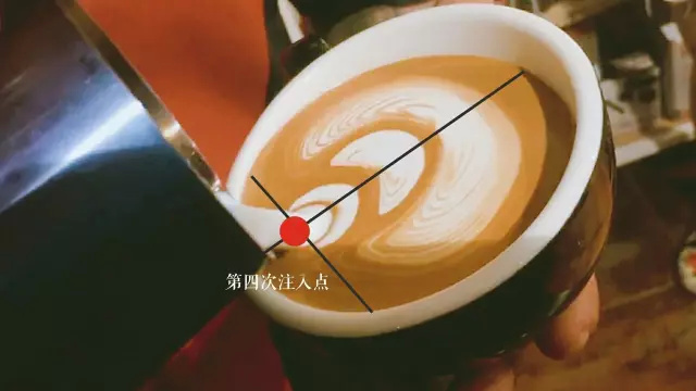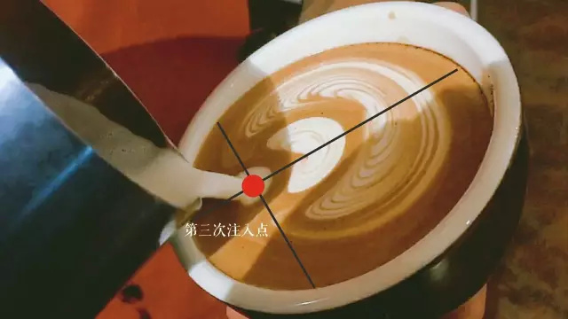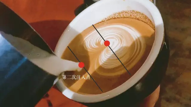 距第一個圖案2~3cm開始第二次注入,左右均勻擺動。待第二個圖案形成后,在第二個圖案前方1~2cm的位置開始向前推送注入蒸汽牛奶。