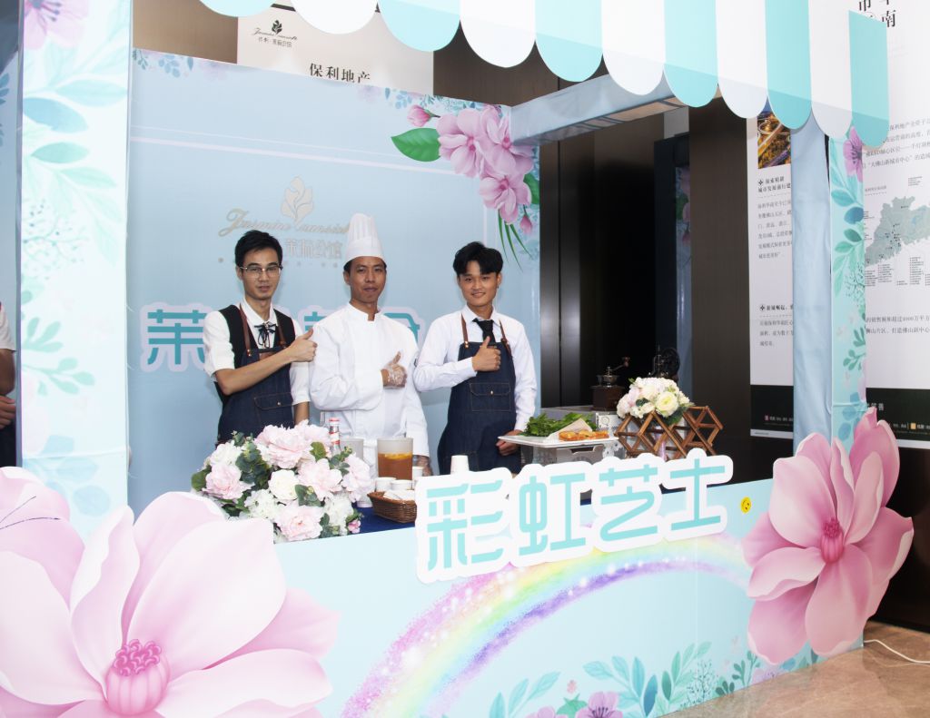 不斷受光顧,不斷有賓客嘗試,一側的小攤漸成全場焦點,雖然都是來看樓盤,但是也都來享受美食與香氣!本次活動,佛山展翅咖啡調酒西點培訓學校的西點學員受邀為全場嘉賓提供美味可口的面包,并在旁邊的香味圖書館展示并提供香味獨特的多種香皂,兩者都是細致的活兒,需要精密入微的心思才能做好。就好比一個音樂家,要想讓全場陶醉于自己的音樂,首先要自己完全投入到彈奏的曲子中,把“自我”放得很低,很謙卑,但是我的音樂藝術至高無上。做面包做香皂又何嘗不是如此呢?佛山展翅的西點學員都有著較高的職業素養,現場的服務周到而且顯出獨卓的品質,給人一種茉莉花香沁入心脾般的舒適感,受到全場嘉賓好評!