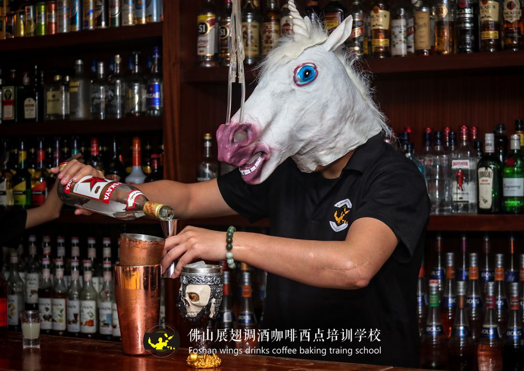 調皮的調酒師為烘托萬圣節氣氛帶上了馬面頭套