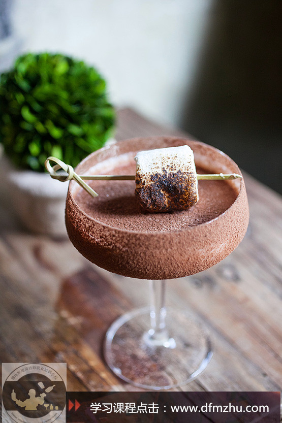 將所有原料放入調酒聽,搖勻后濾入碟形香檳杯,以烤棉花糖裝飾。